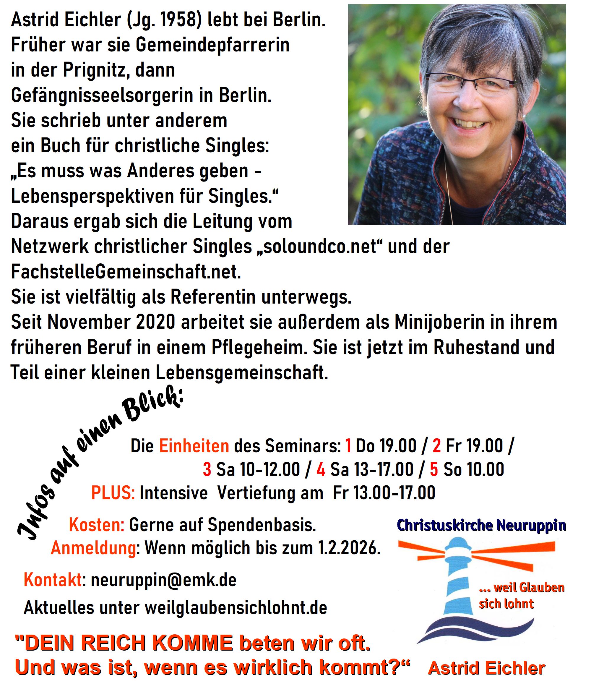 Auch in 2026 lädt die Christuskirche Neuruppin ein zu echter Weiterbildung und Stärkung für unseren Glauben! Alle, die aus de Region OPR, PR und darüber hinaus geistlich wachsen und Früchte der Liebe in ihrem Leben bringen möchten, sind herzlich eingeladen. Das Seminar startet am Donnerstagabend, 5.2. und endet am Sonntagvormittag, dem 8.2.26. Die Teilnahme ist auf Spendenbasis möglich.